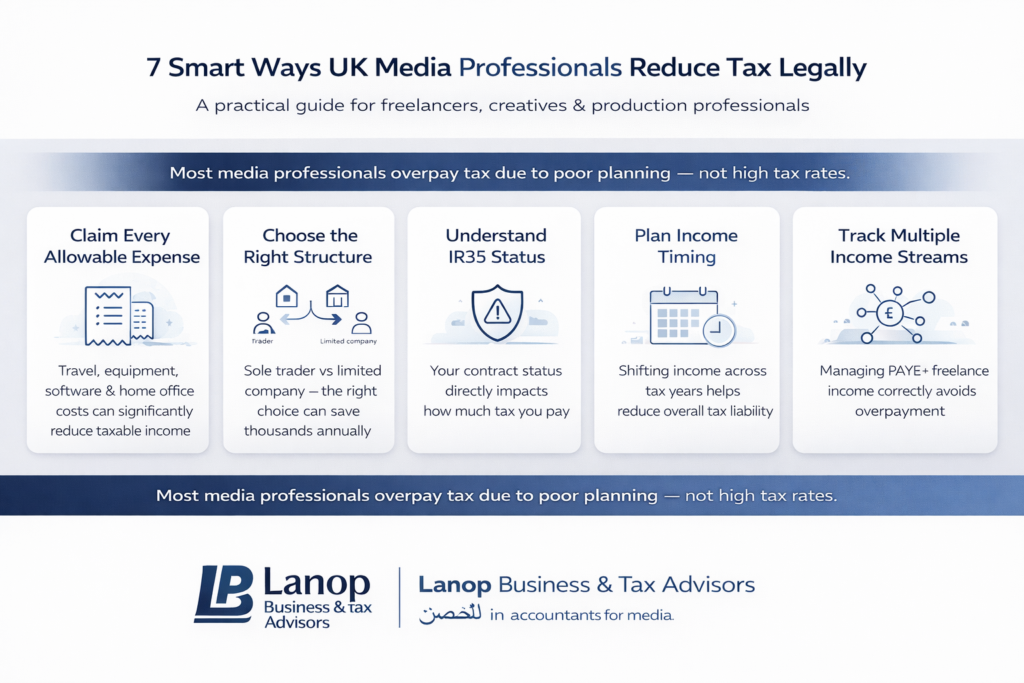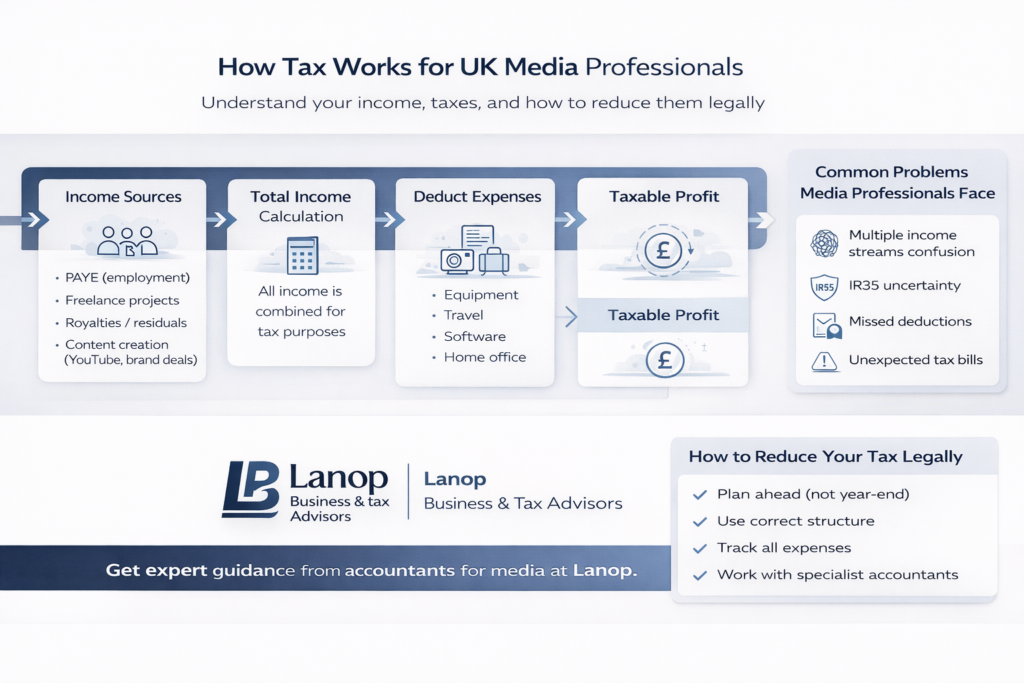 Lanop Business and Tax Advisors specializes in working with media professionals, creatives, and freelancers across the UK. We understand the unique challenges of irregular income, project-based work, and evolving tax regulations that affect your industry.